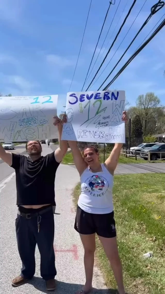 A woman smiling with crossed arms, wearing a navy blue Severn River Rugby t-shirt, outdoors with trees in the background.