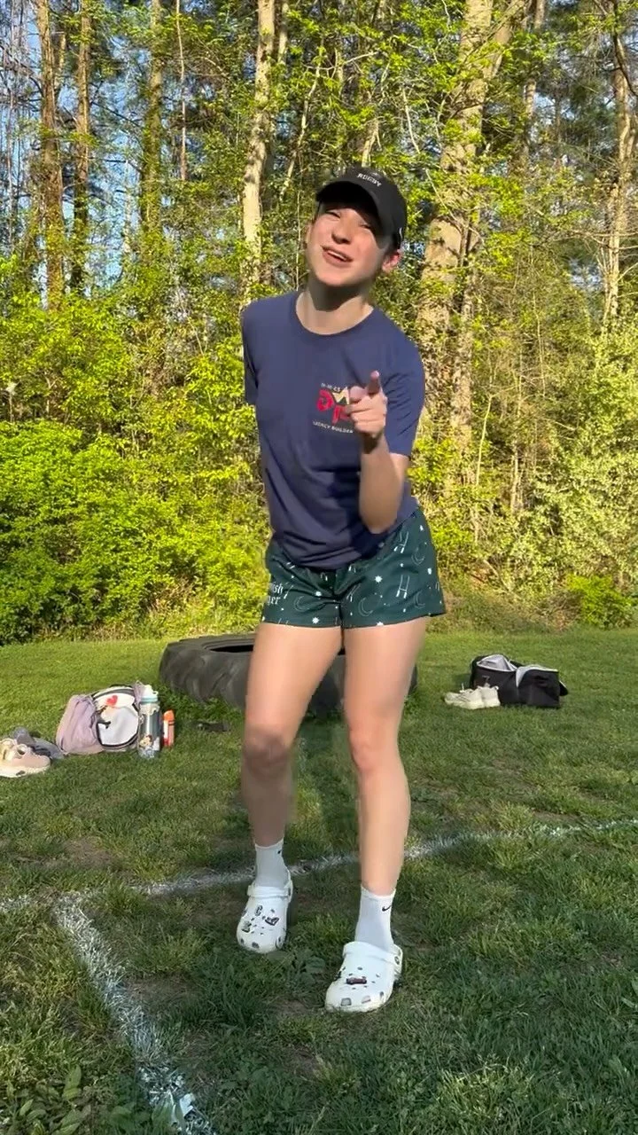 A young woman with blonde hair, smiling, standing outdoors on a field with trees in the background, wearing a navy blue sports t-shirt and shorts, and an Apple Watch on her left wrist.